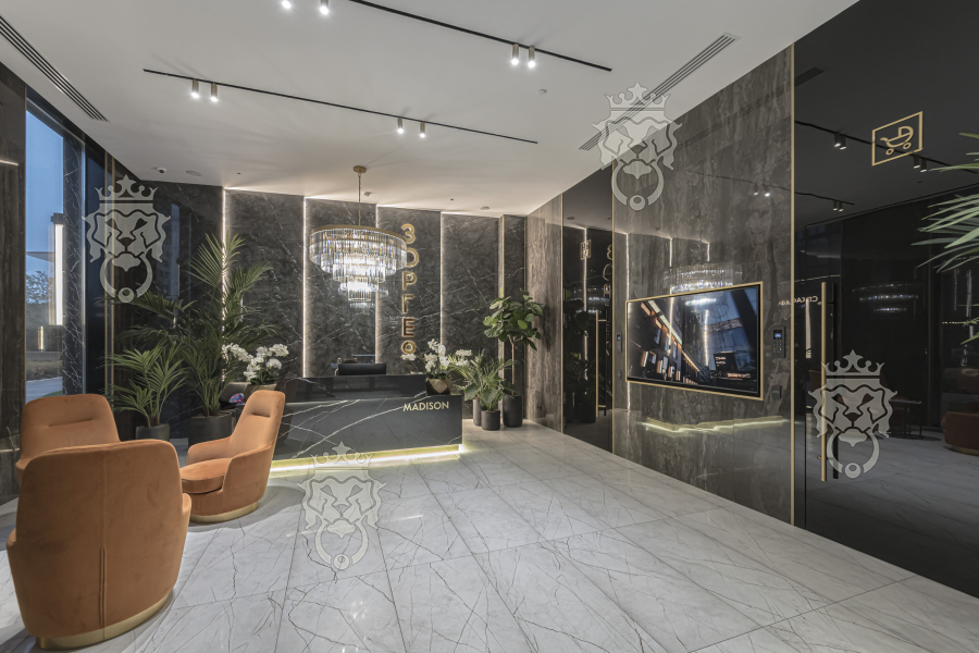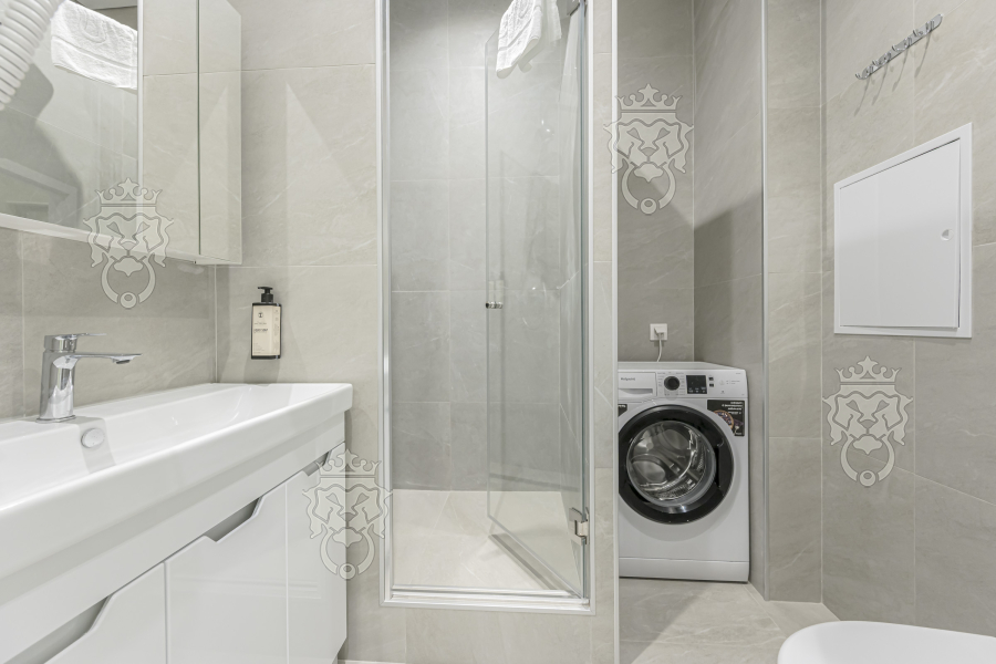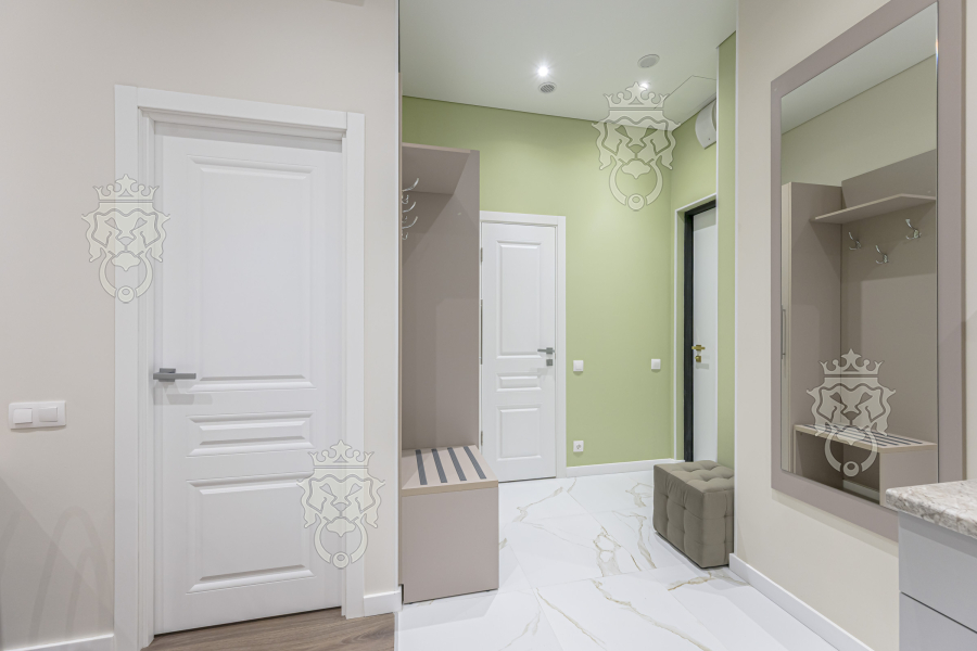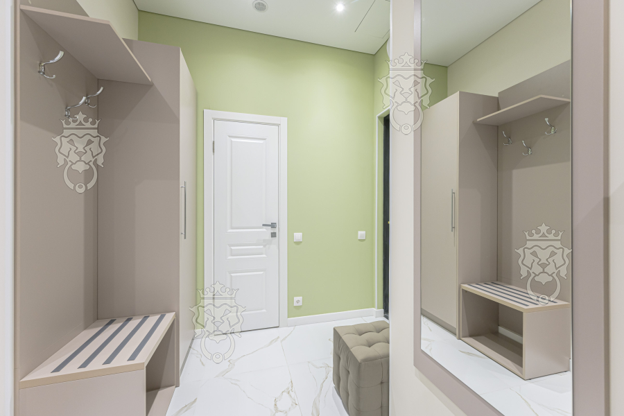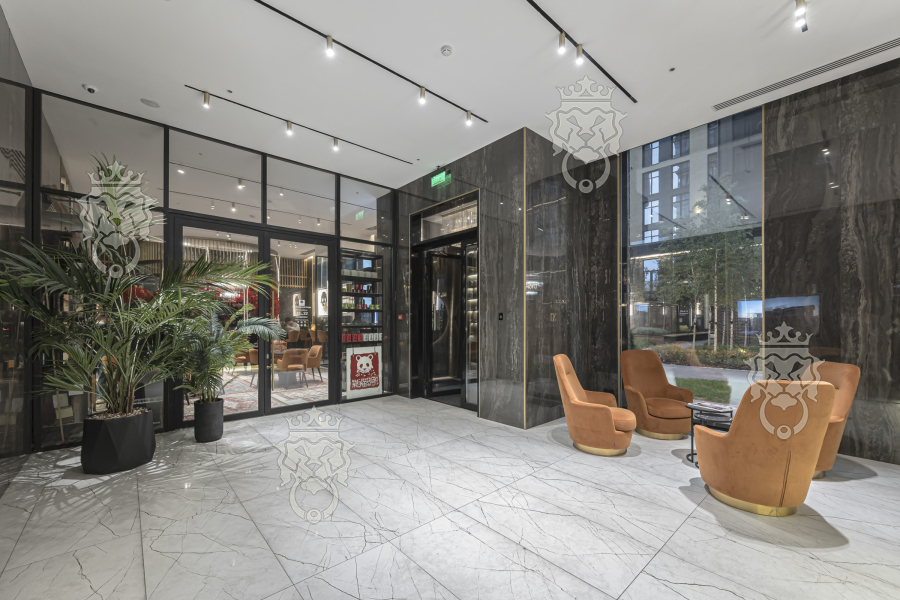 На первом этаже презентабельная входная группа с лобби, зайти можно по FaceID или отпечатку пальца. Видеонаблюдение. Консьерж.
